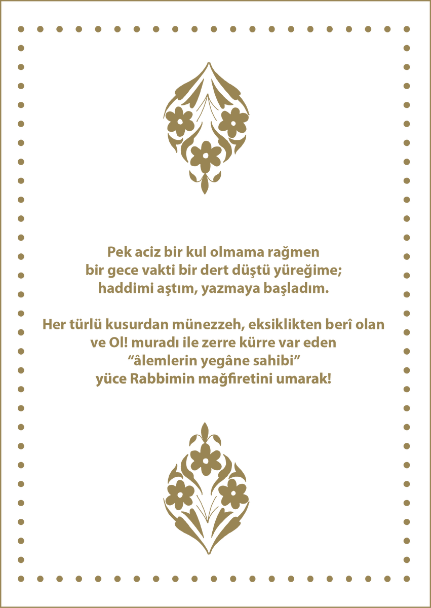 Tüm çalışmalarımda olduğu gibi bu eserin vücut bulmasında da hassas tenkidleriyle bana destek veren sevgili ve kıymetli eşime en içten muhabbetlerimi sunuyor, yayıma hazırlık sürecinde eseri hassasiyetle inceleyip değerli tenkidlerini ileten diğer dostlarımıza içtenlikle teşekkür ediyorum. Bundan sonraki süreçlerde de hatalarımı tashih edecek, yapıcı tenkidlerini iletecek okuyucularımızı minnetle yad edeceğimi belirtiyor, kendilerine peşinen gönül dolusu şükranlarımı sunuyorum.